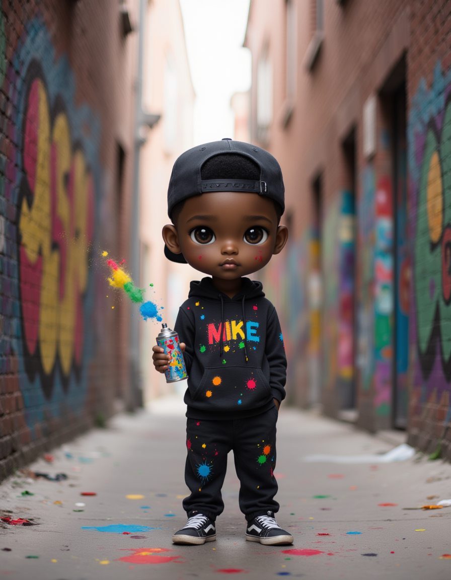 The model as a chibi street artist, wearing a hoodie with paint splatters, a backwards cap, and baggy pants. He holds a spray can with colorful mist coming out. The background is an urban alley with vibrant graffiti murals and brick walls. The style is in cute chibi anime illustration.