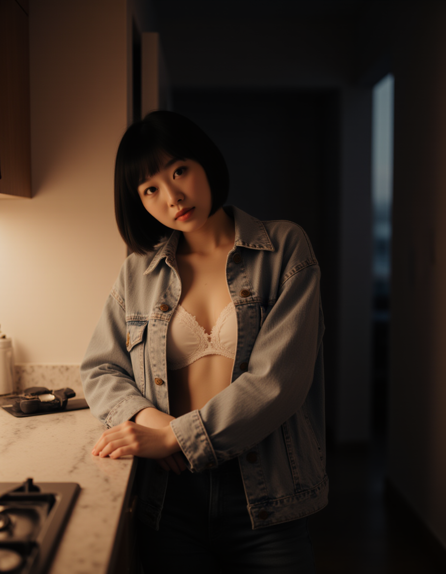 model leaning against a kitchen counter at night, wearing an oversized shirt half-buttoned, revealing lace underneath. the glow from the open fridge softly lights her skin, giving the photo a spontaneous, sensual OnlyFans after-hours feel.
