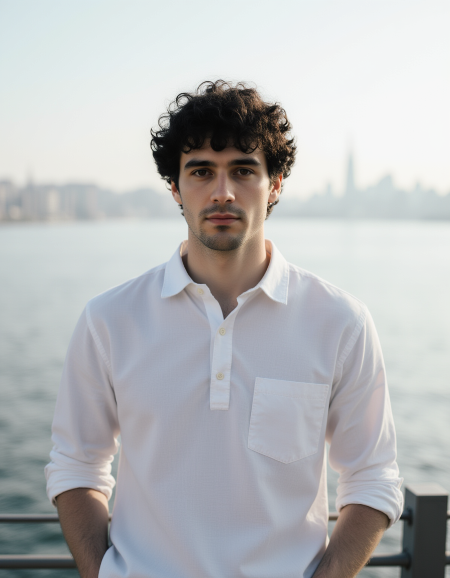 model leaning on a railing overlooking water, calm expression, slightly tousled hair from the breeze, minimalistic composition suited for Hinge photos