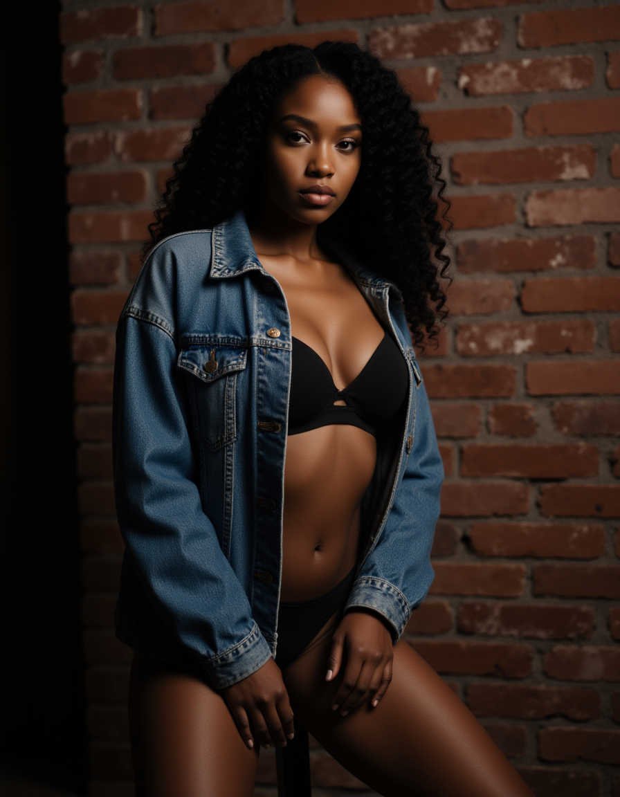 model posing against a brick wall, wearing an oversized denim jacket that slips off one shoulder revealing black lingerie underneath. her hand rests on her thigh, and the moody lighting creates dramatic contrast across her curves.
