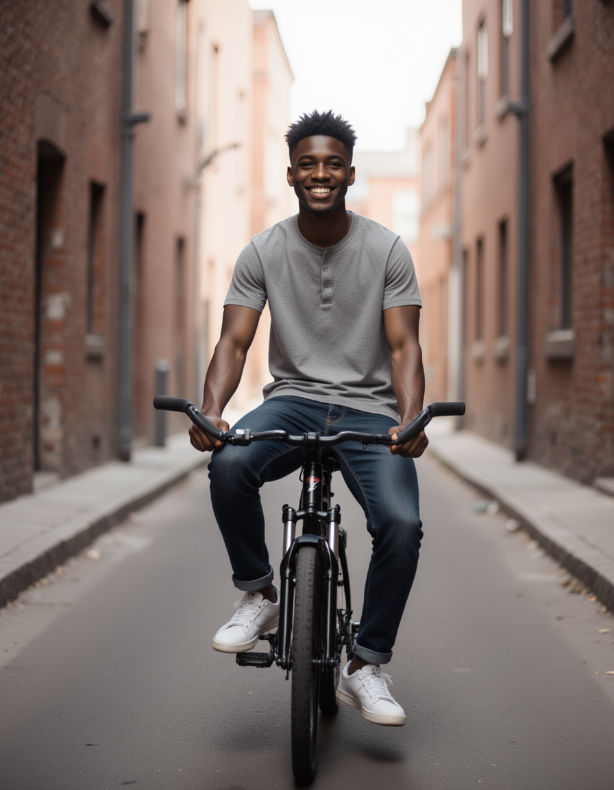 model sitting on a bicycle in a quiet street, casual posture, natural smile, warm tones and an approachable Hinge-style aesthetic