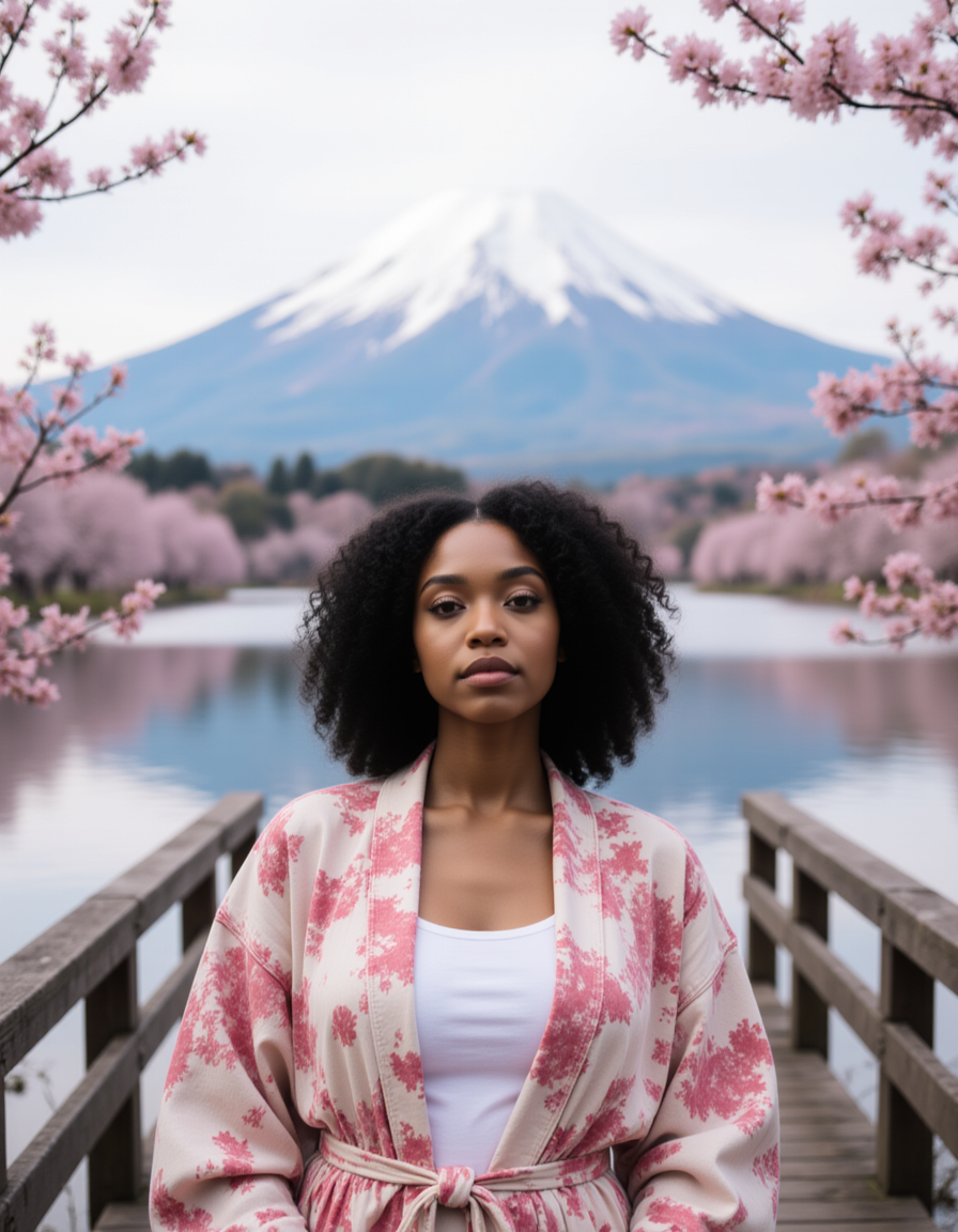 Model standing on a wooden bridge in front of Mount Fuji, Japan, with the snow-capped peak reflected in a tranquil lake. She wears a casual kimono-inspired jacket and has a peaceful, contemplative expression. Cherry blossoms frame the scene. Soft natural lighting with misty atmospheric background, serene Japanese landscape aesthetic