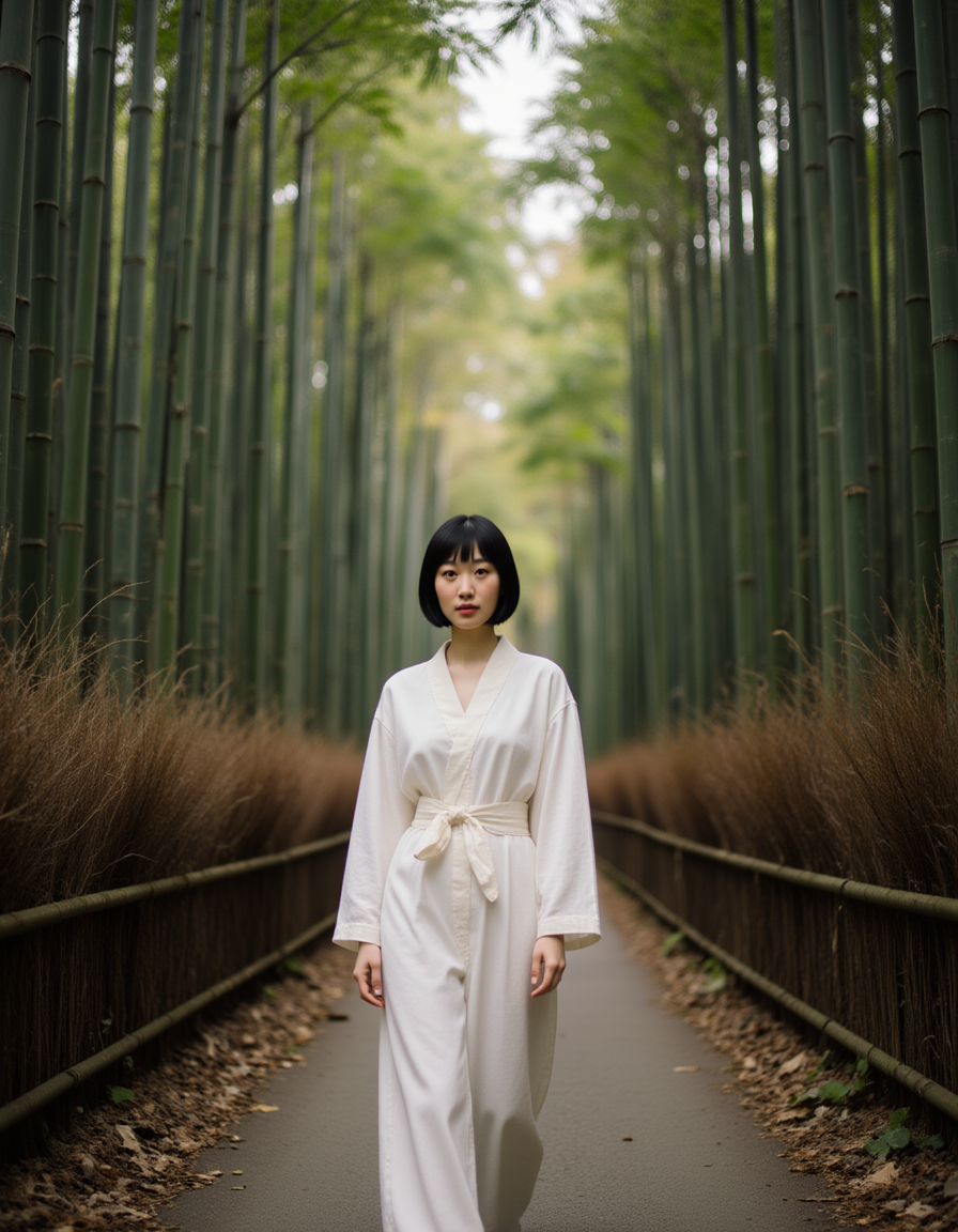 Model walking through a bamboo forest in Arashiyama, Kyoto, with towering green bamboo stalks creating natural columns around her. She wears a flowing kimono-inspired outfit and has a serene, meditative expression. Soft filtered natural light through the canopy, tranquil Japanese nature atmosphere with cultural elegance
