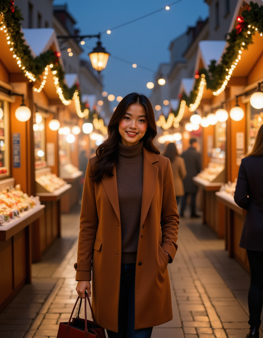 A model walking through a European-style Christmas market at night, wearing a camel wool coat and carrying shopping bags, with wooden vendor stalls decorated with lights and wreaths, steam rising from mulled wine stands, and a magical festive marketplace scene