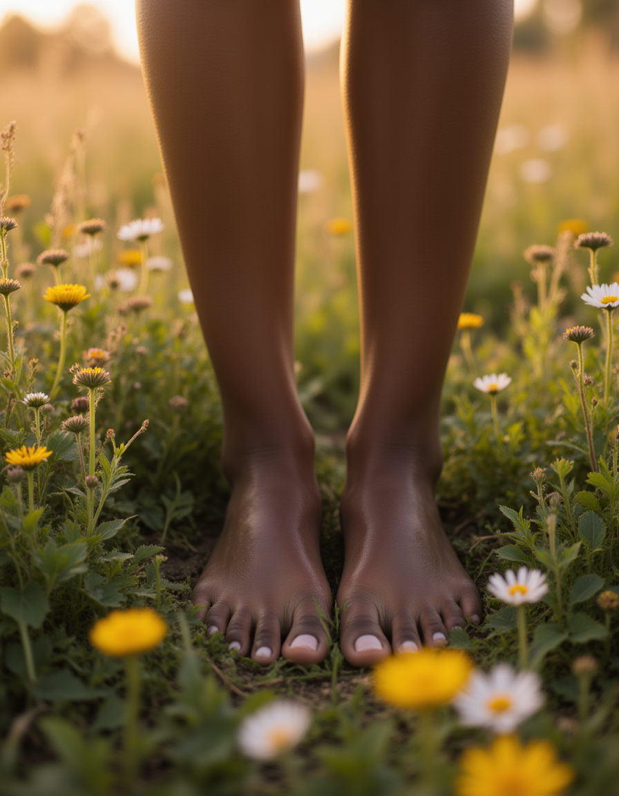 Model's bare feet sinking into soft, dew-kissed grass in a meadow at dawn, with wildflowers scattered around, also showing the bottom of feet.