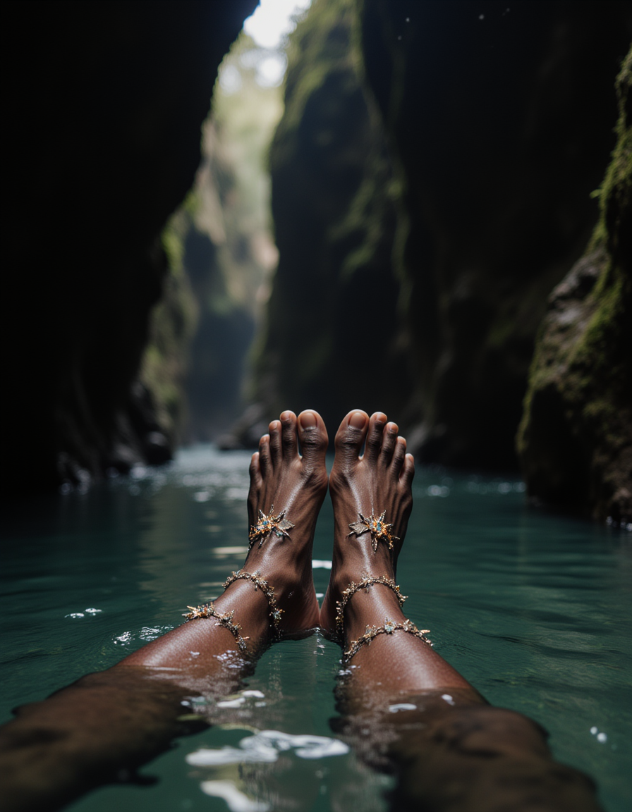 Model's feet adorned with jagged, crystalline anklets, submerged in a pool of viscous, glowing liquid in a cavernous, otherworldly grotto, also showing the bottom of feet.