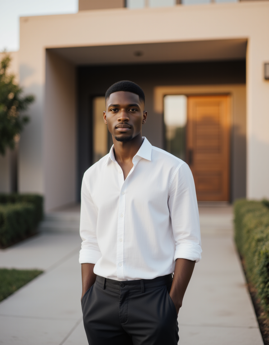 Outdoor luxury real estate headshot of the model, standing near a modern villa entrance, soft golden hour lighting, clean business-casual outfit, natural confident expression, editorial-style photography