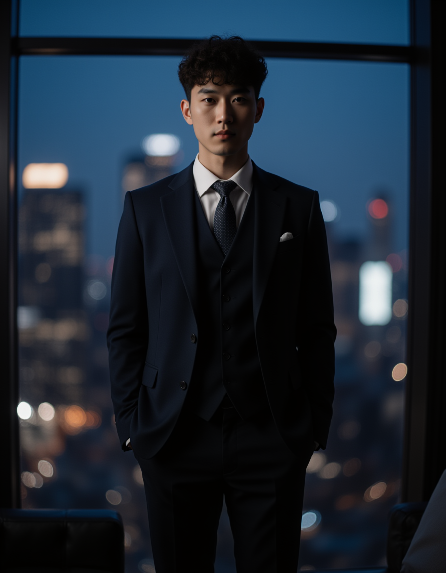 person in a sophisticated three-piece suit with an unbuttoned collar, standing in a penthouse with city lights blurred in the background, moody blue-toned lighting