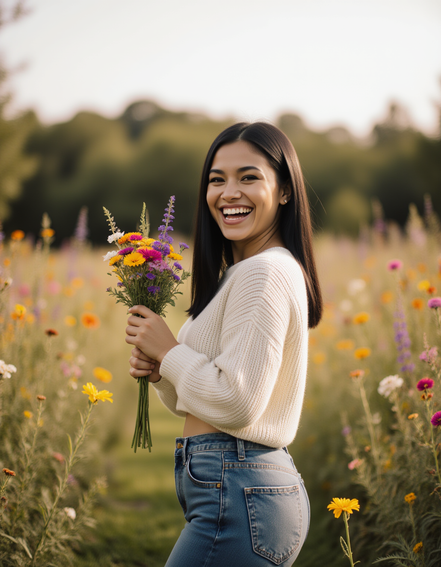 a playful feminine model laughing while holding a bouquet of wildflowers in a meadow, in casual jeans and a cropped sweater, capturing a joyful and free-spirited moment
