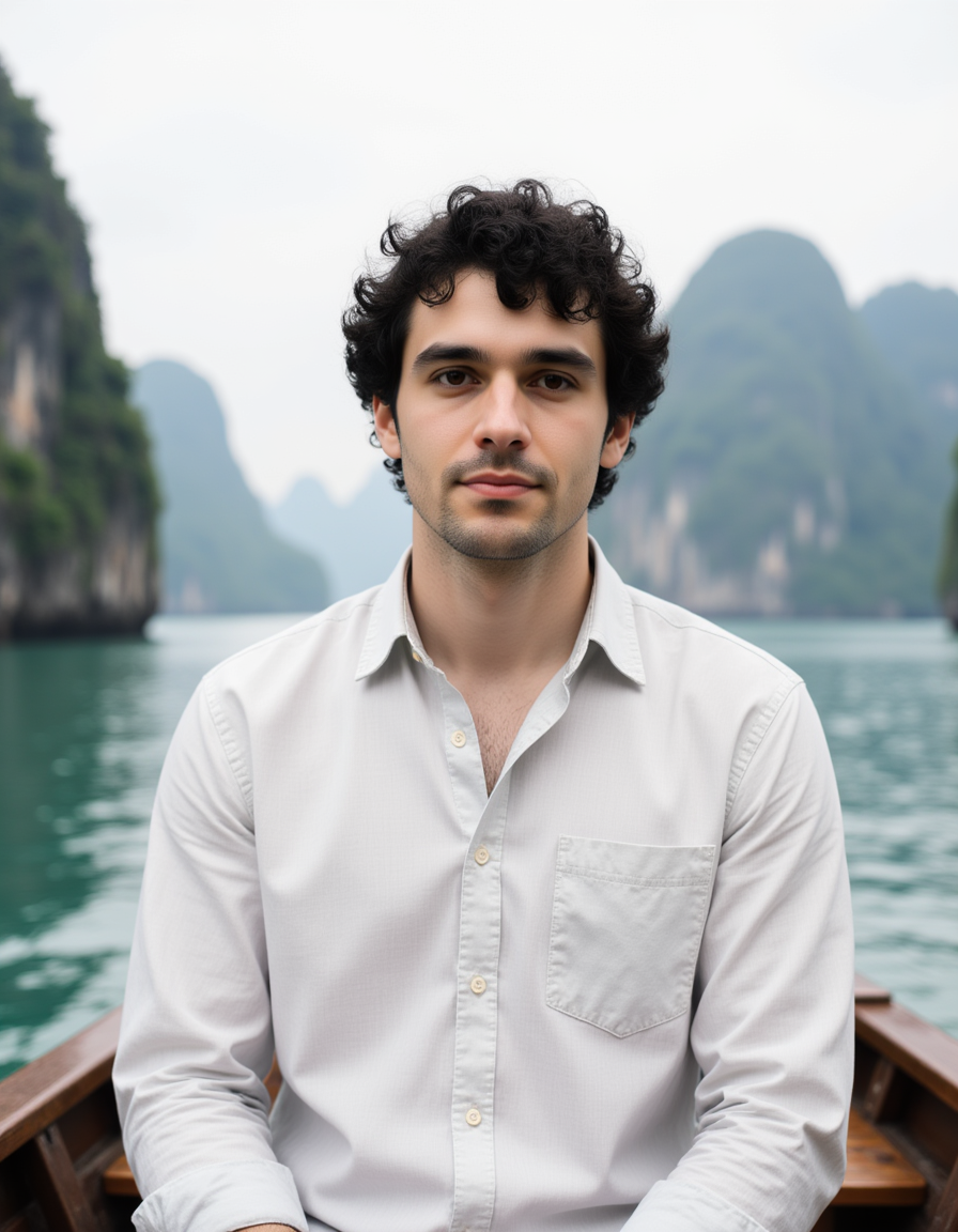 Portrait of a model on a boat in Ha Long Bay, Vietnam, with dramatic limestone karst formations rising from emerald waters in the background. He wears a light linen shirt unbuttoned at the collar and has a relaxed, adventurous expression. Soft overcast natural light, breathtaking Asian seascape with atmospheric mist