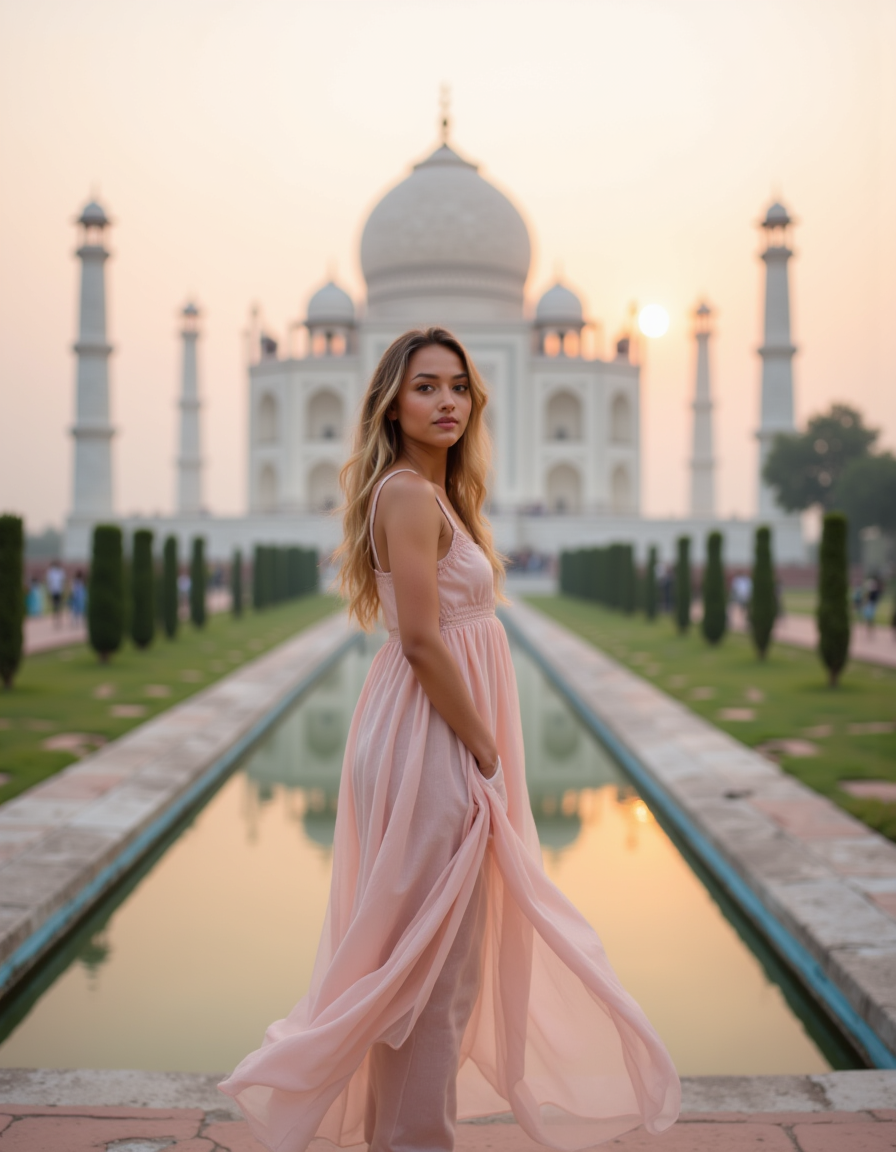 Portrait of a model standing in front of the Taj Mahal at sunrise, with the iconic white marble mausoleum and reflecting pools in the background. She wears a flowing pastel-colored dress and has a graceful, serene expression. Soft pink and golden morning light creates a romantic atmosphere, breathtaking Indian architectural wonder with ethereal travel photography aesthetic