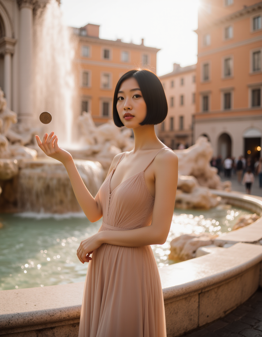 Portrait of a model standing in front of the Trevi Fountain in Rome, with the ornate Baroque sculptures and cascading water illuminated behind her. She wears an elegant evening dress and has a romantic, enchanted expression tossing a coin over her shoulder. Warm golden evening light, classic Italian landmark with dreamy travel photography aesthetic