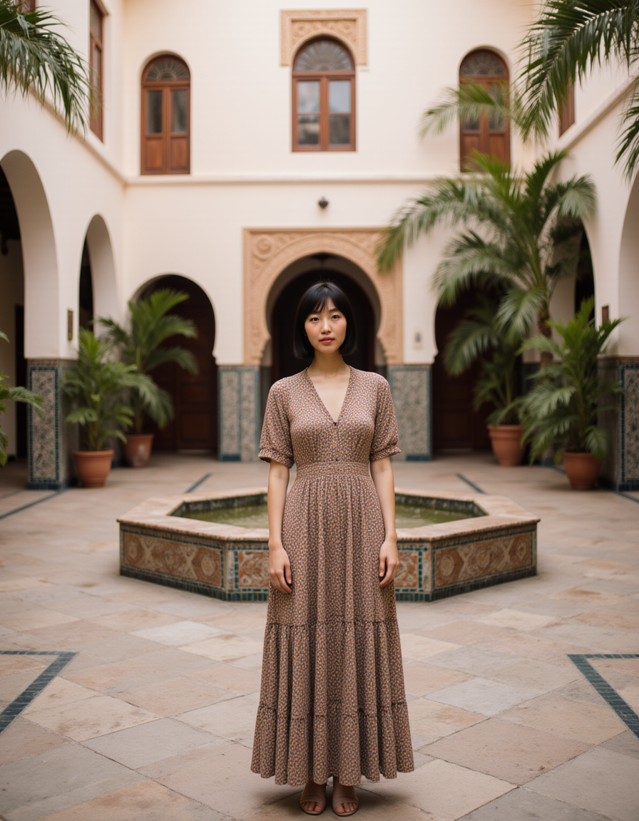 Portrait of a model in a traditional riad courtyard in Fes, Morocco, with intricate zellige tile work, carved wooden doors, and a central fountain surrounded by lush plants. She wears a elegant caftan-inspired dress and has a graceful, curious expression. Dappled courtyard light filtering through, authentic Moroccan architectural atmosphere with exotic cultural richness