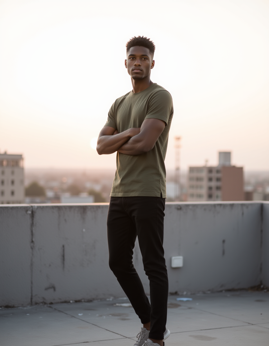 posed on a rooftop with soft skyline backdrop, sleeves slightly rolled, candid look away from camera that feels authentic and effortless