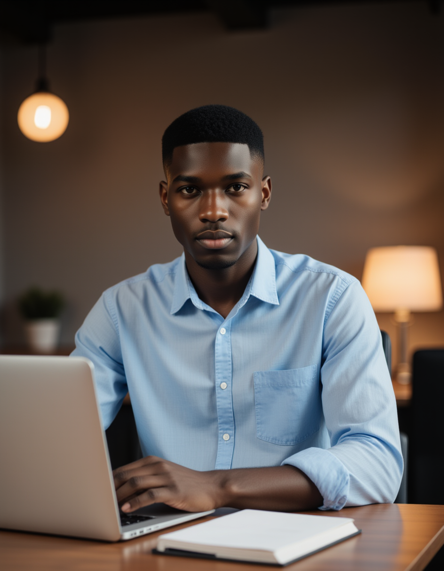 professional business portrait, model sitting at a desk with laptop and notebook, rolled sleeves, focused look, warm ambient lighting, blurred office environment, LinkedIn-ready tone