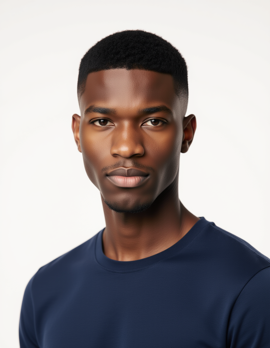 professional passport photo of the model for Argentine passport, neutral expression, looking straight at camera, plain white background, balanced flash lighting, no accessories, symmetrical framing, ID-style