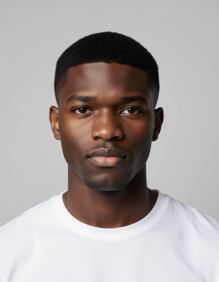 professional passport photo of the model for Emirati passport, neutral expression, centered head, plain light gray background, soft studio lighting, no jewelry or hats, symmetrical composition, ID photo