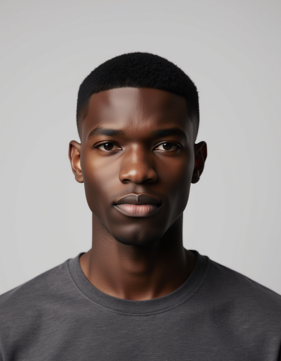 professional passport photo of the model for Kenyan passport, neutral expression, centered head, plain light gray background, soft daylight, no accessories, symmetrical composition, ID-style