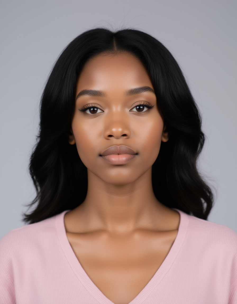 professional passport photo of the model for Moroccan passport, neutral expression, centered head, plain light gray background, balanced soft lighting, no shadows, symmetrical composition, ID-style
