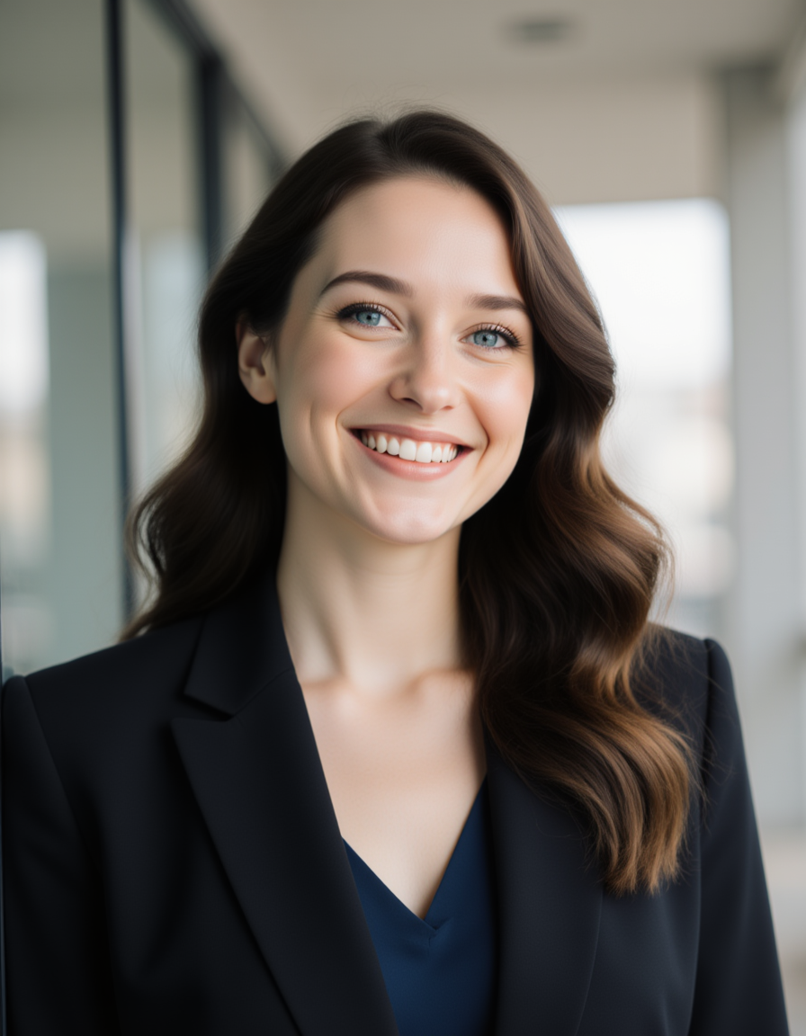 Professional real estate agent headshot of the model, confident smile, wearing a tailored blazer, polished hairstyling, soft natural lighting, blurred modern office background, premium corporate portrait style
