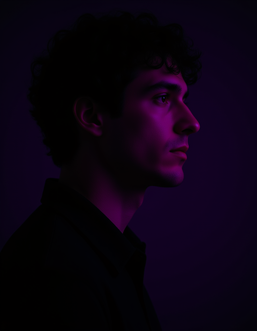 Profile portrait of a model with defined jawline, illuminated by a single intense purple gel light from the side while subtle orange fill light adds depth. He has a serious, stoic expression looking into the distance. Minimal dark background with negative space, cinematic and noir-influenced