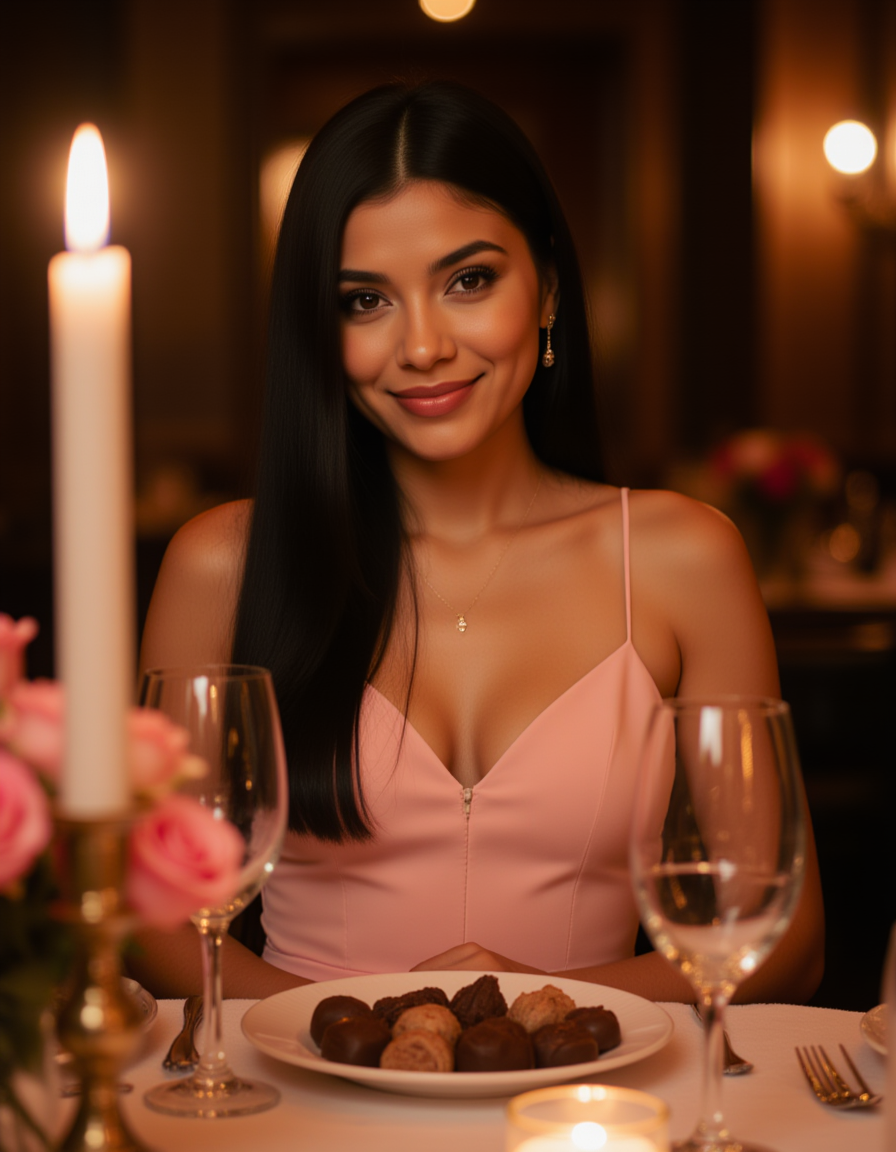 A radiant female model wearing a soft pink dress, sitting at a candlelit dinner table adorned with roses and chocolates, smiling gently under warm Valentine’s glow.