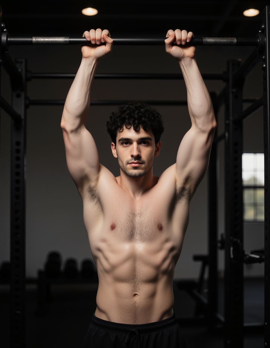 shirtless male athlete with ripped physique, performing pull-ups on a bar, veins popping on arms, gym background with weights scattered, dynamic action shot, ultra-detailed, dramatic shadows