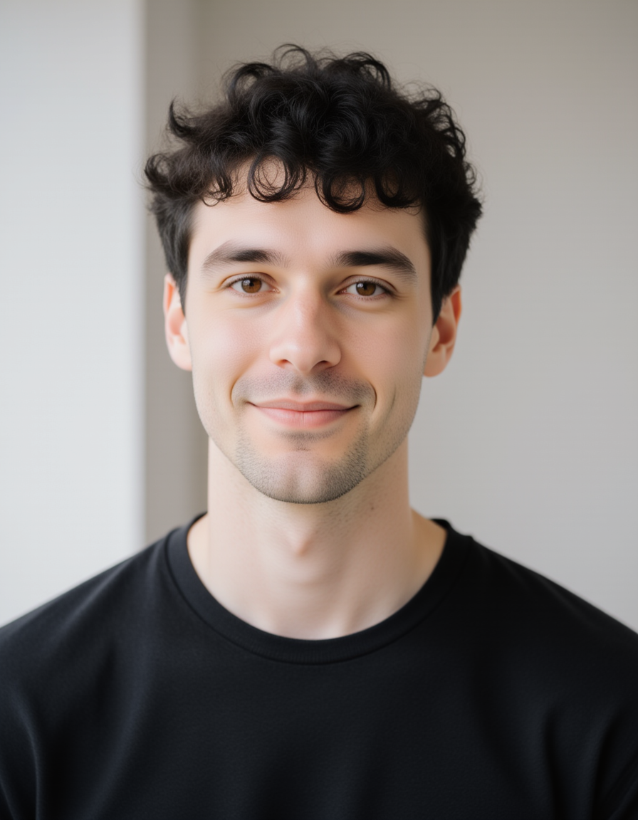 simple indoor portrait against a clean wall, soft directional lighting, relaxed shoulders and a neutral expression that feels warm and trustworthy