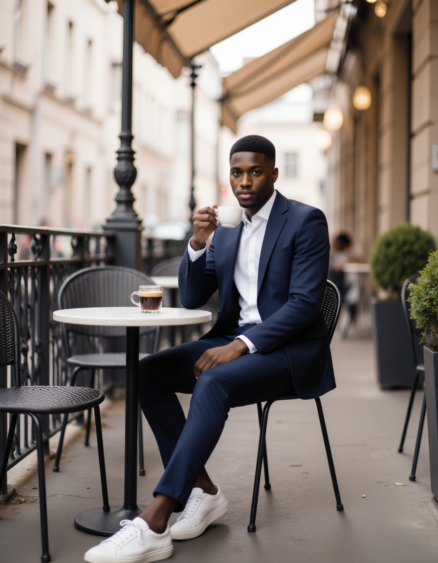 A sophisticated model sitting at a small round table on a Parisian cafe terrace, sipping an espresso and looking at the camera, wearing a relaxed navy suit paired with clean white leather sneakers, with classic Haussmannian architecture defining the background