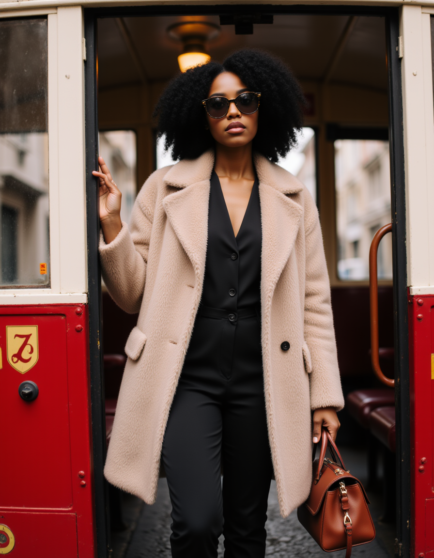 A sophisticated model stepping off a vintage tram in Milan, wearing a tailored faux fur statement coat and oversized designer sunglasses with her eyes looking over the top at the camera, carrying a structured leather handbag, historic Italian architecture in the background, fashion editorial feel