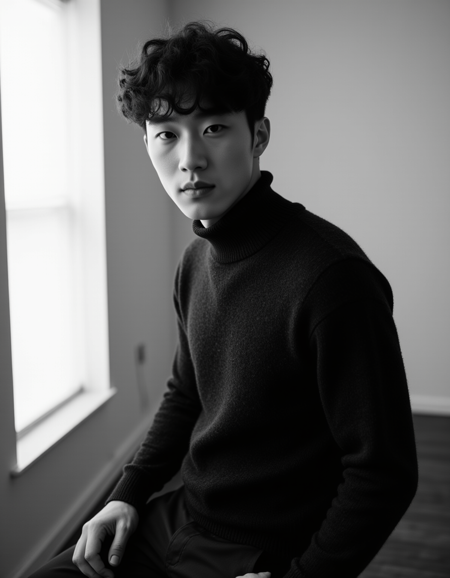 a striking black and white portrait shot with a strong jawline and intense gaze, wearing a textured turtleneck in a studio setting, polished AI glamour photos style