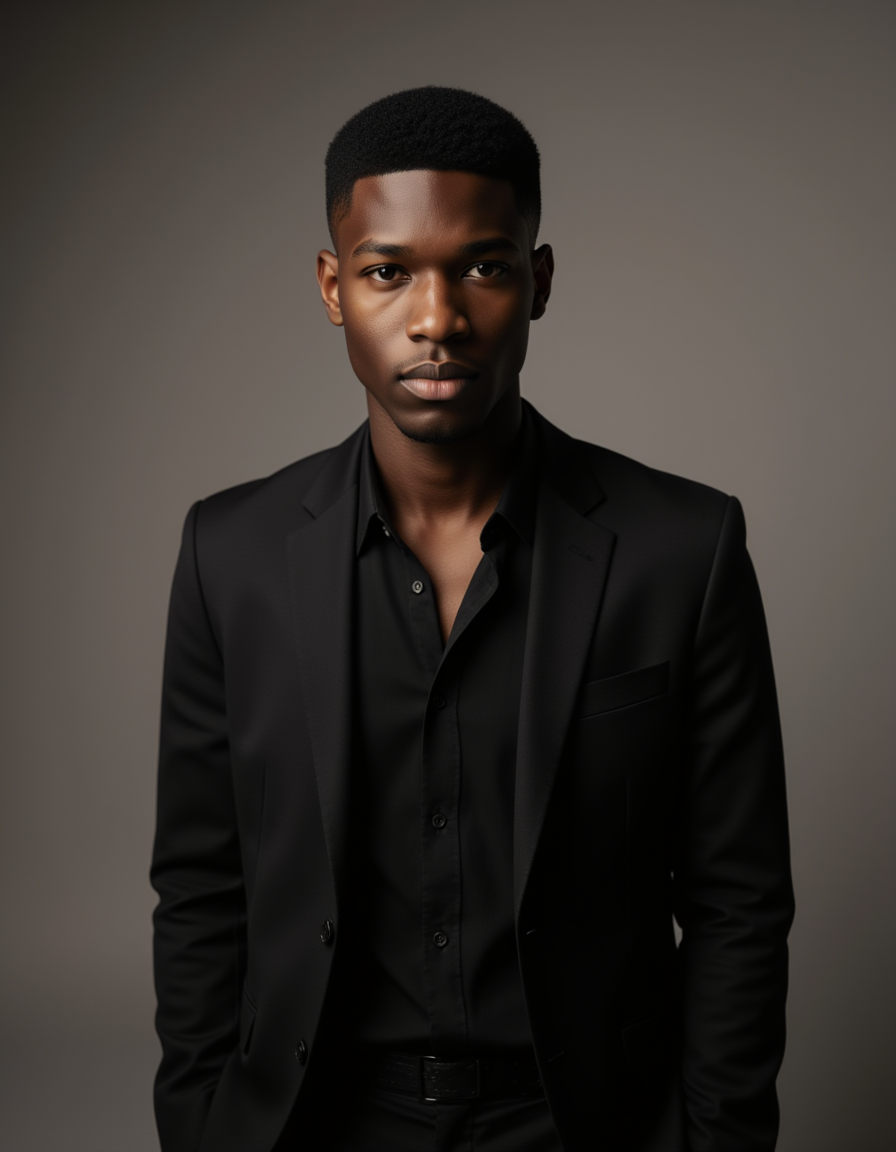 studio headshot, model in dark suit jacket with open collar shirt, relaxed but confident posture, soft shadows, matte neutral background, cinematic lighting emphasizing facial features