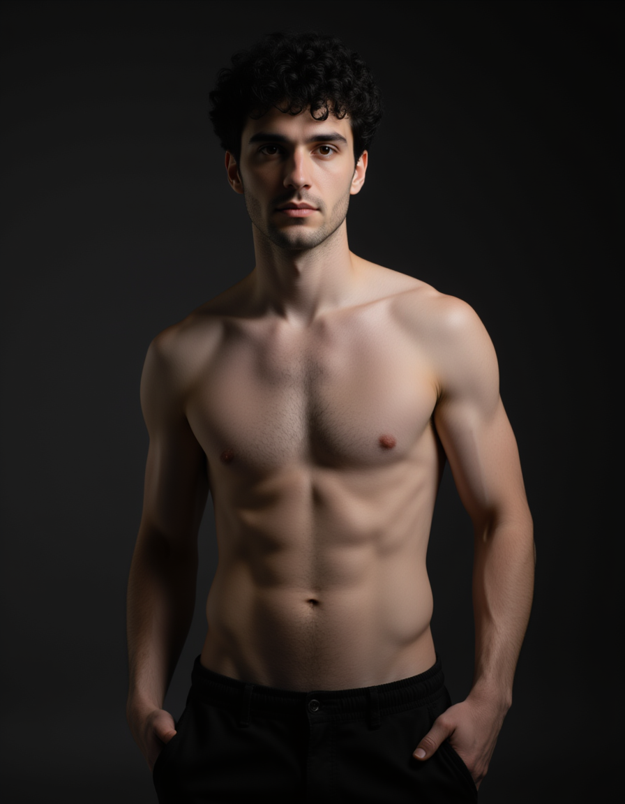 Studio portrait of a male model in minimal clothing. Dramatic top lighting, sculpted physique highlighted, artistic fine-art photography.