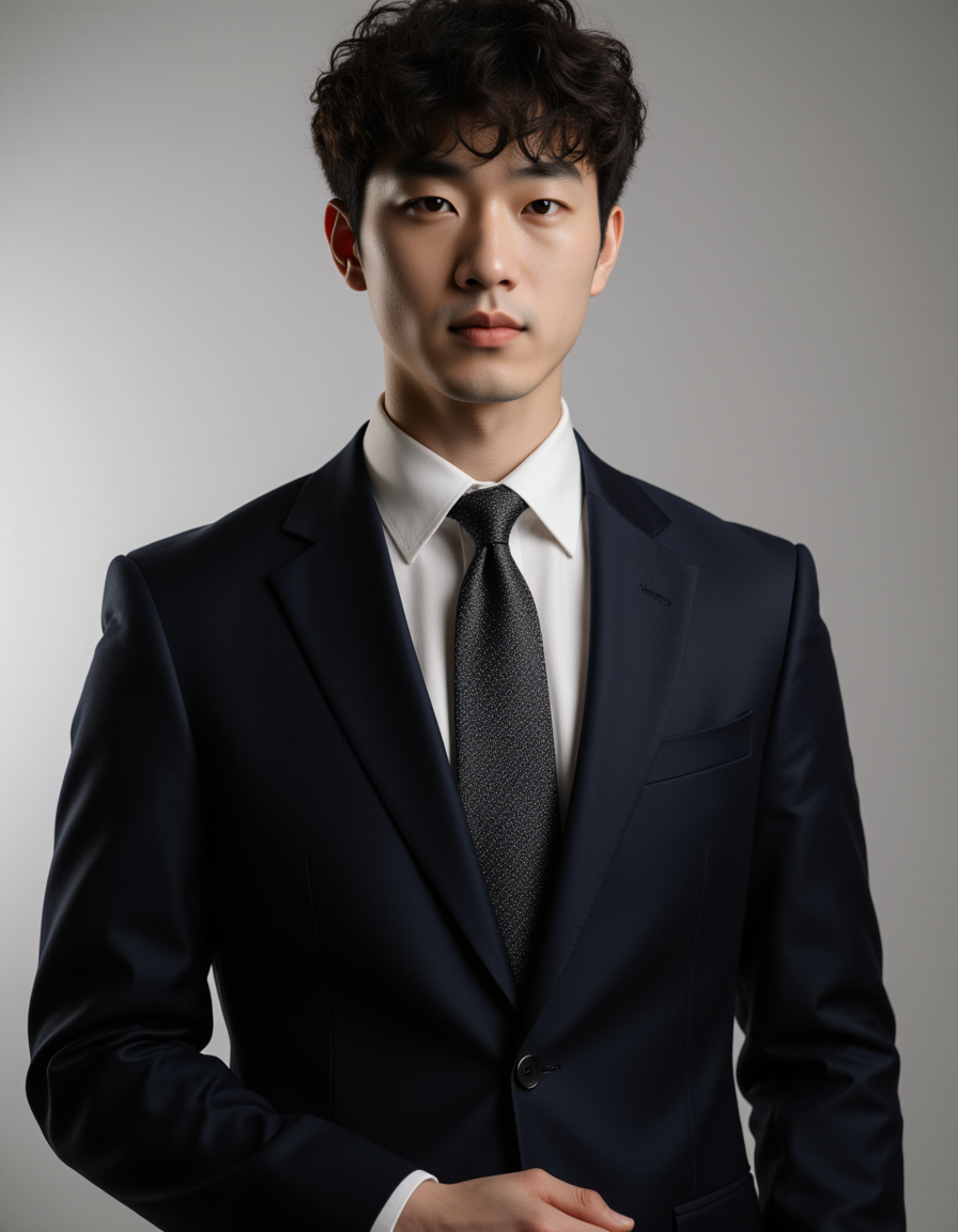 Studio portrait of a male model wearing a tailored suit. Strong jawline highlighted by side lighting, minimalistic background, professional editorial photography.