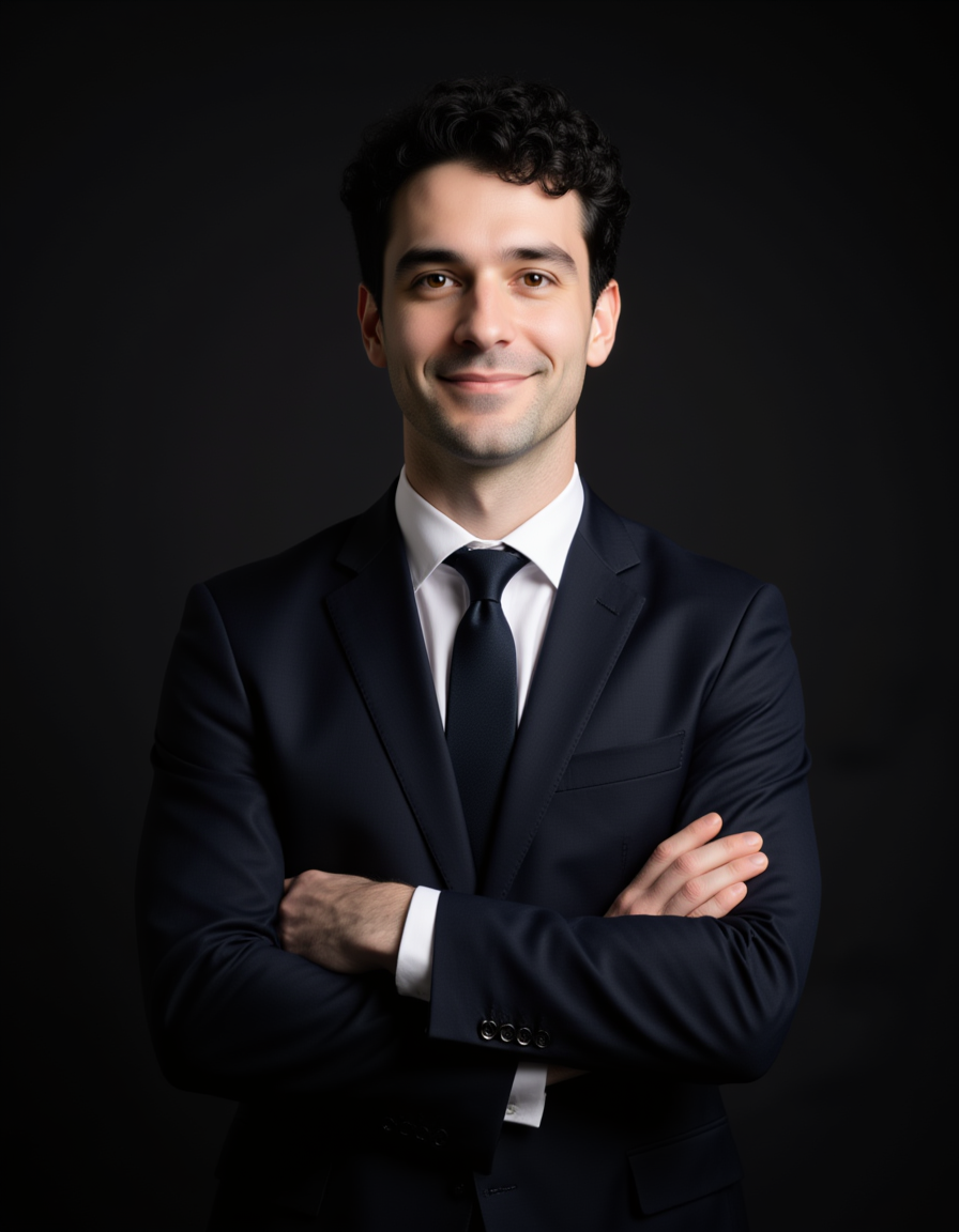 studio portrait, model in formal attire, arms crossed, slight smile, subtle rim lighting for depth, dark neutral background, sharp focus, professional and trustworthy presence