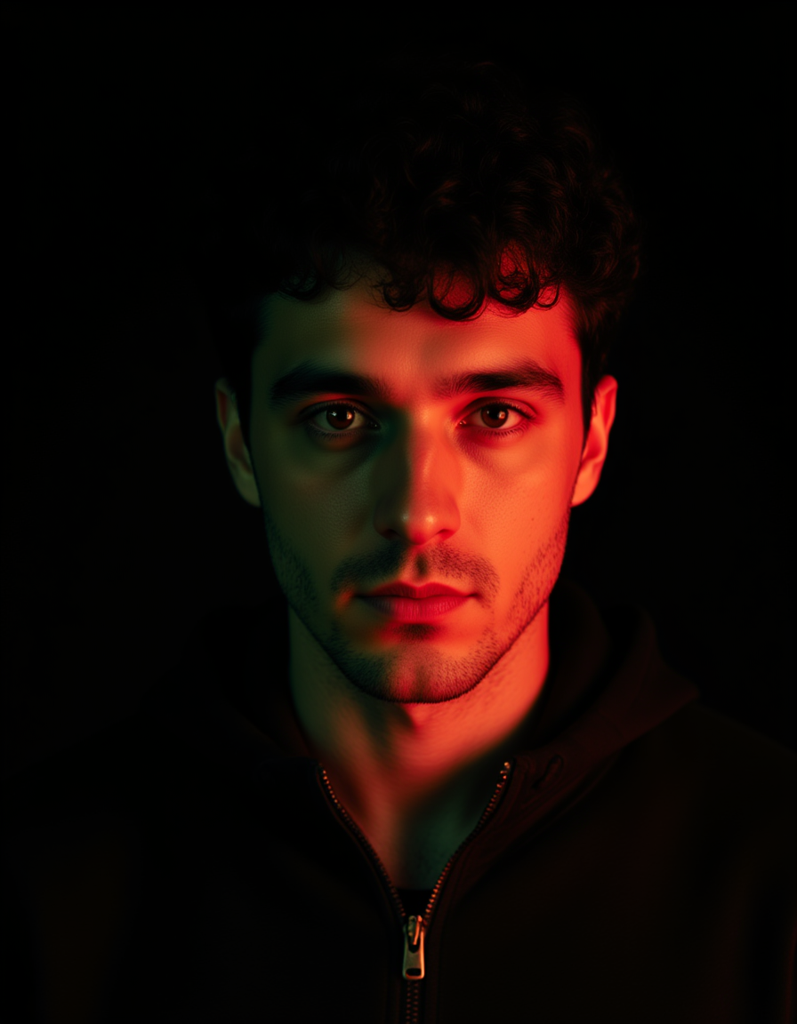 Studio portrait of a model with strong facial structure, illuminated by dramatic red and green RGB lighting from opposite angles creating bold color contrast. He has a confident, intense expression with direct eye contact. Wearing a dark zip-up jacket. Minimal black background, cinematic and edgy with vibrant color grading