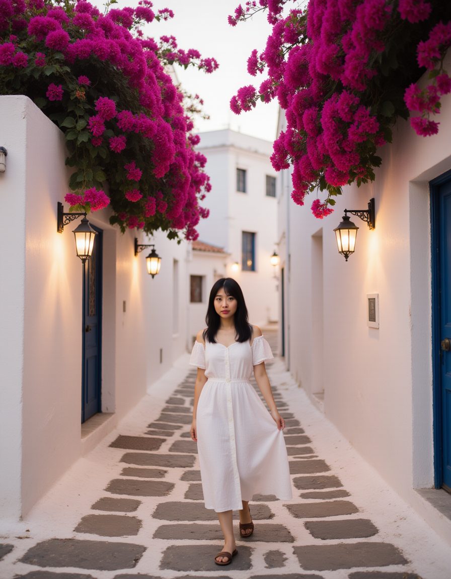 a stylish figure strolling through narrow, winding cobblestone alleyways in Chora, surrounded by vibrant fuchsia bougainvillea illuminated by warm lantern light against whitewashed walls, wearing a flowing white linen dress and Greek sandals