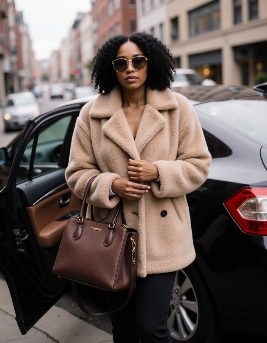 a stylish individual in a plush faux fur coat and designer sunglasses stepping out of a luxury sedan, carrying a structured leather handbag, blurred city street background, editorial look