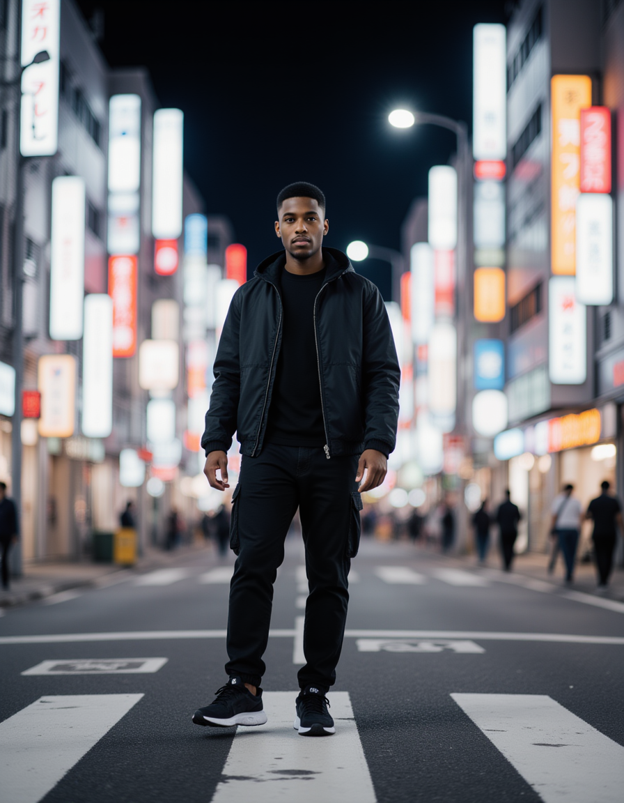 A stylish model caught mid-stride crossing a busy intersection in Tokyo's Shinjuku district at night, wearing a layered black techwear jacket, cargo pants, and futuristic sneakers, looking towards the camera as neon signs reflect off wet asphalt, raw street photography aesthetic