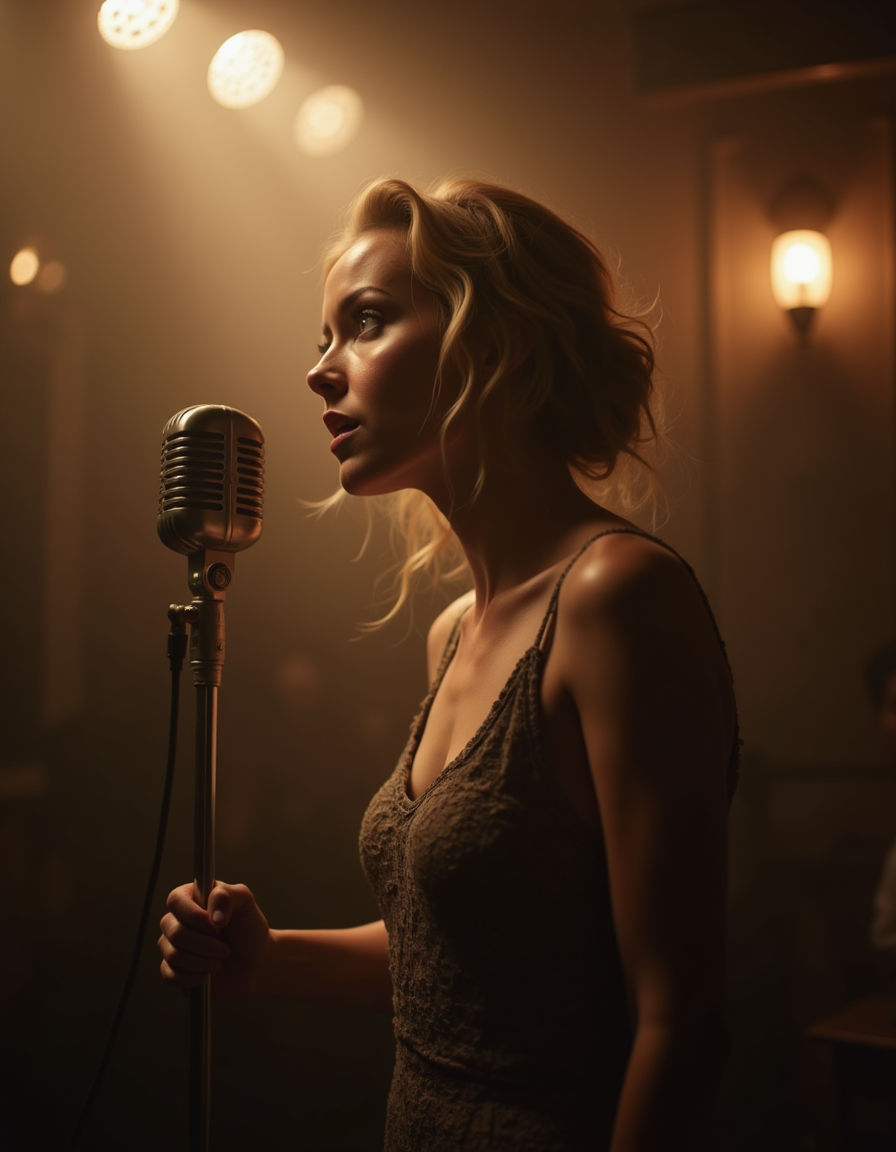 Ultra realistic photograph of model as 1920s Jazz singer in Art Deco club, vintage microphone, smoky atmosphere, film noir lighting, sepia tones