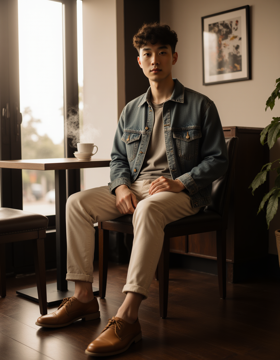 urban Bali café photoshoot, stylish casual outfit with natural textures, seated with a coffee, relaxed influencer aesthetic under soft morning light