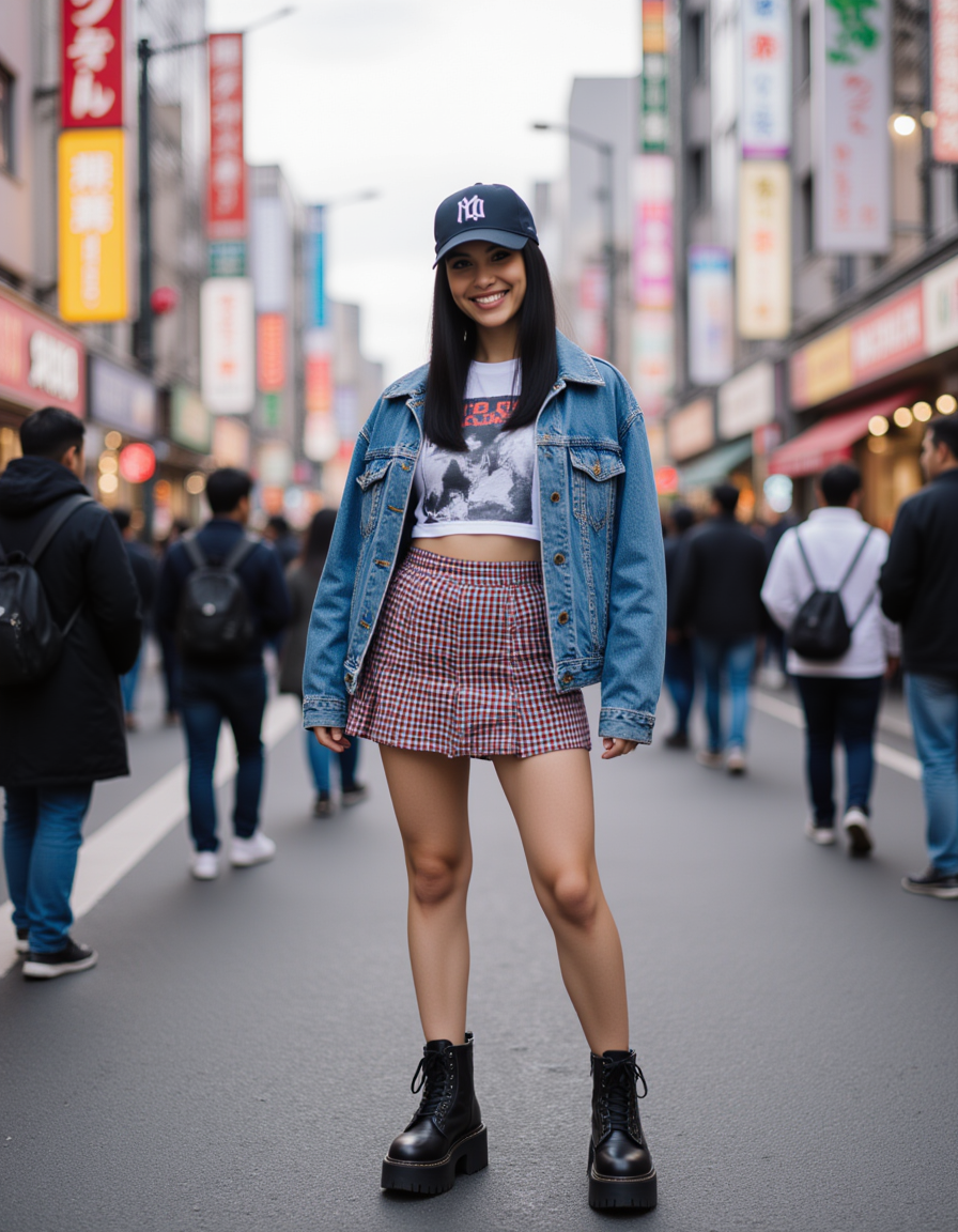 A vibrant model posing in the crowded streets of Harajuku, Tokyo, wearing bold, layered colorful streetwear including a pleated skirt and chunky platform boots, smiling directly at the camera surrounded by other pedestrians and bright shop signs, energetic urban vibe