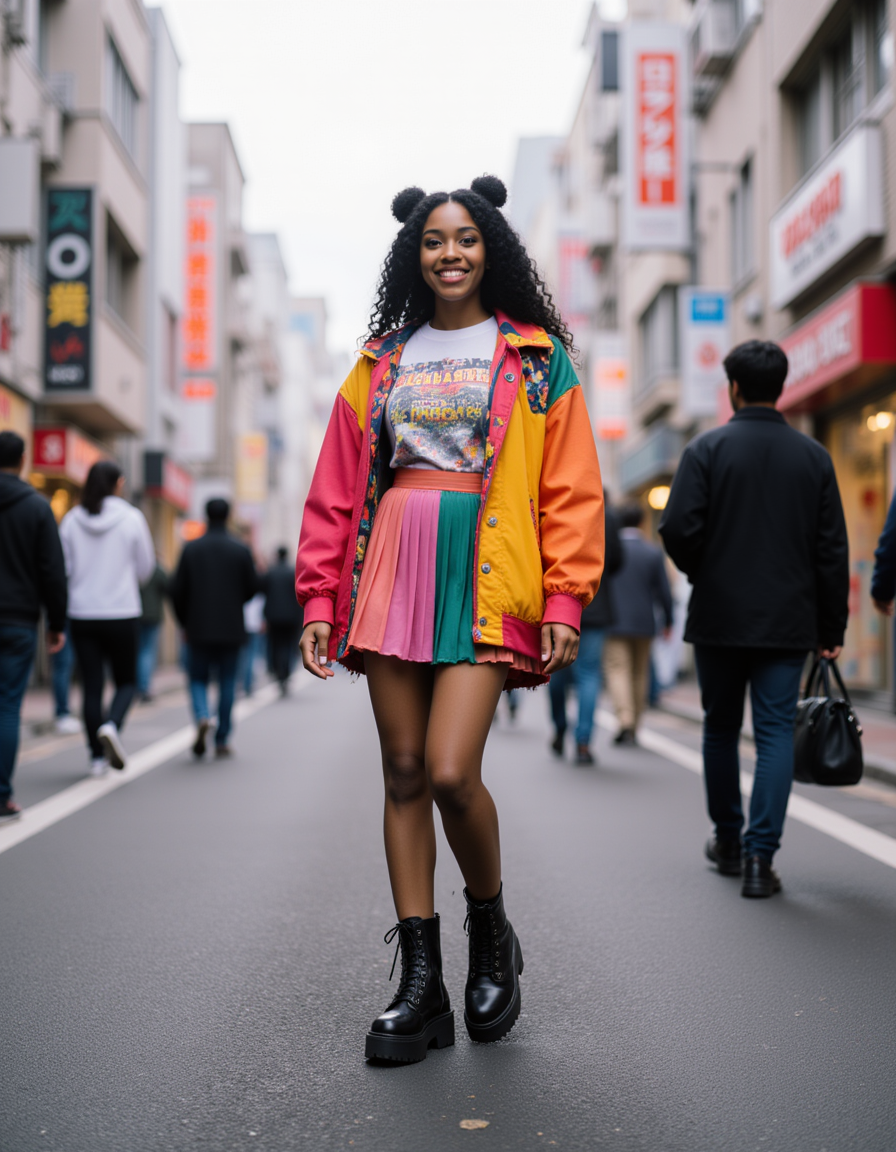 A vibrant model posing in the crowded streets of Harajuku, Tokyo, wearing bold layered colorful streetwear including a pleated skirt and chunky platform boots, smiling directly at the camera surrounded by other pedestrians and bright shop signs, energetic urban vibe