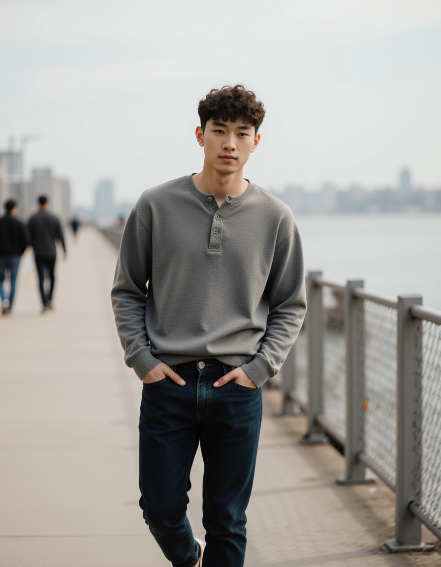 walking along a waterfront path, subtle motion in the background, confident stride and a calm, genuine expression