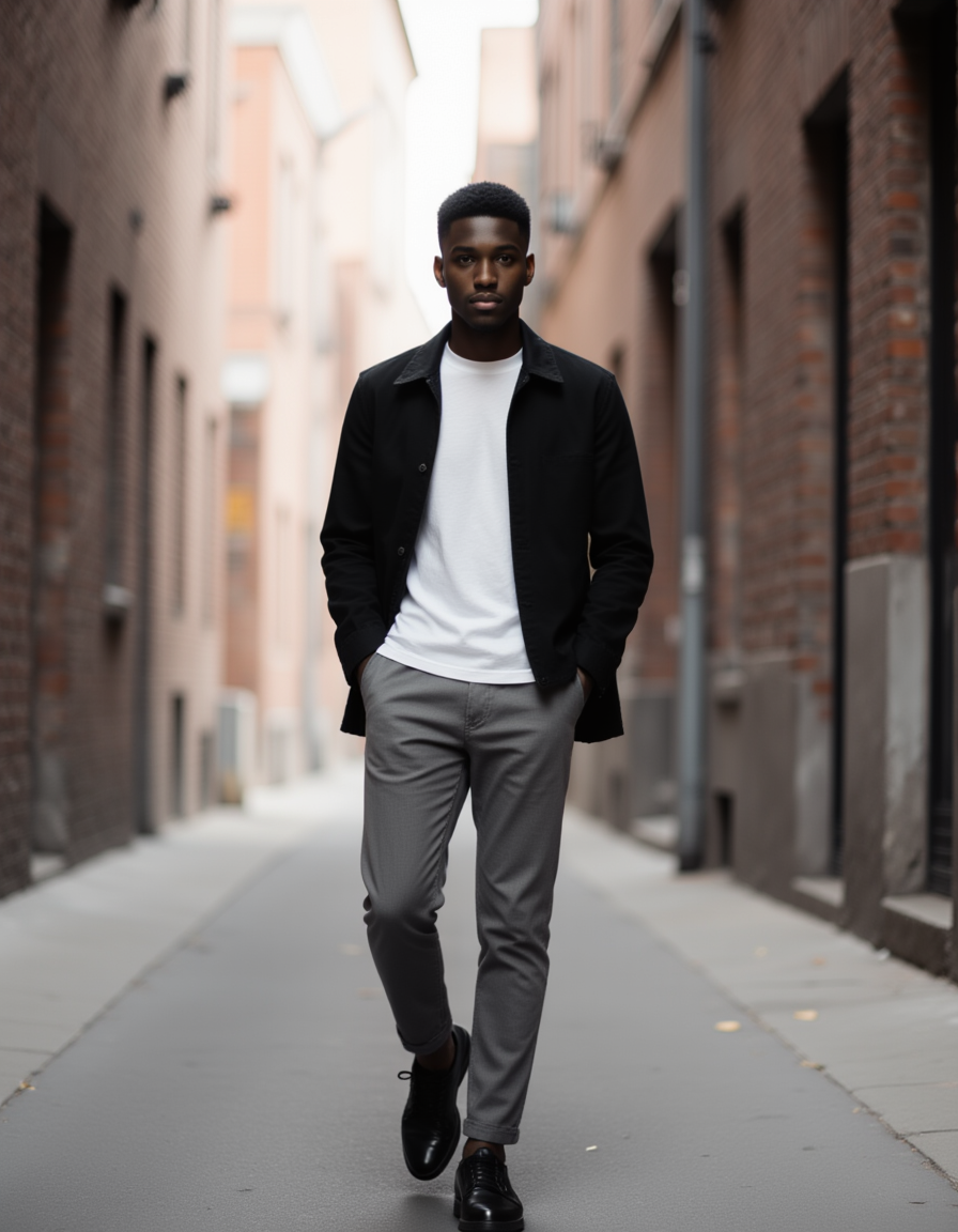 walking confidently on a quiet city street, hands in pockets, subtle motion blur behind, crisp styling with a relaxed yet intentional pose